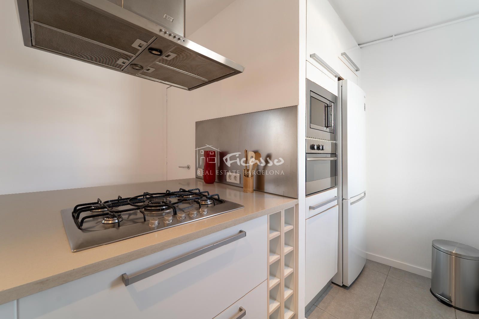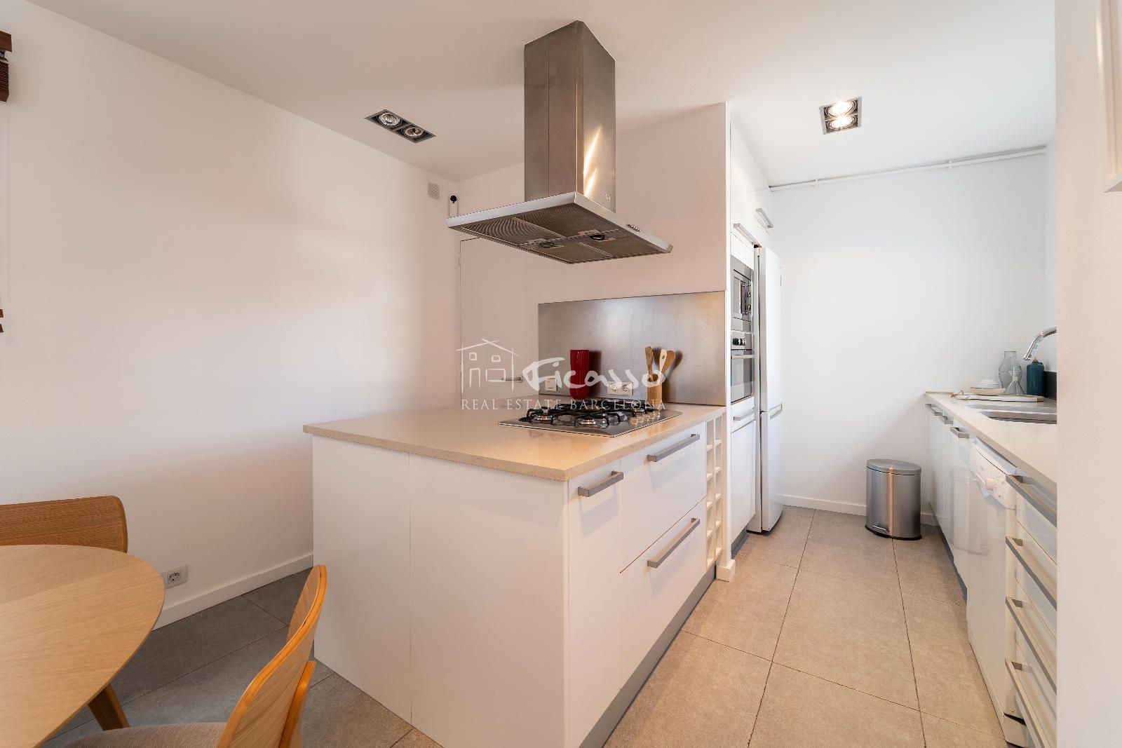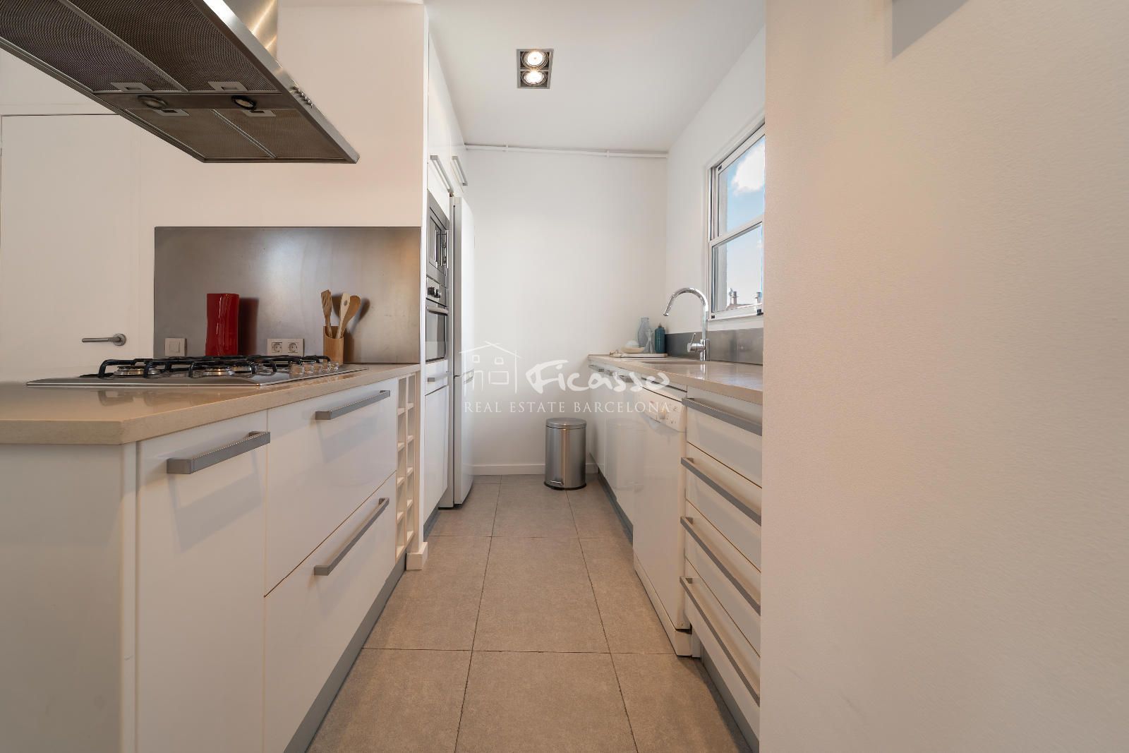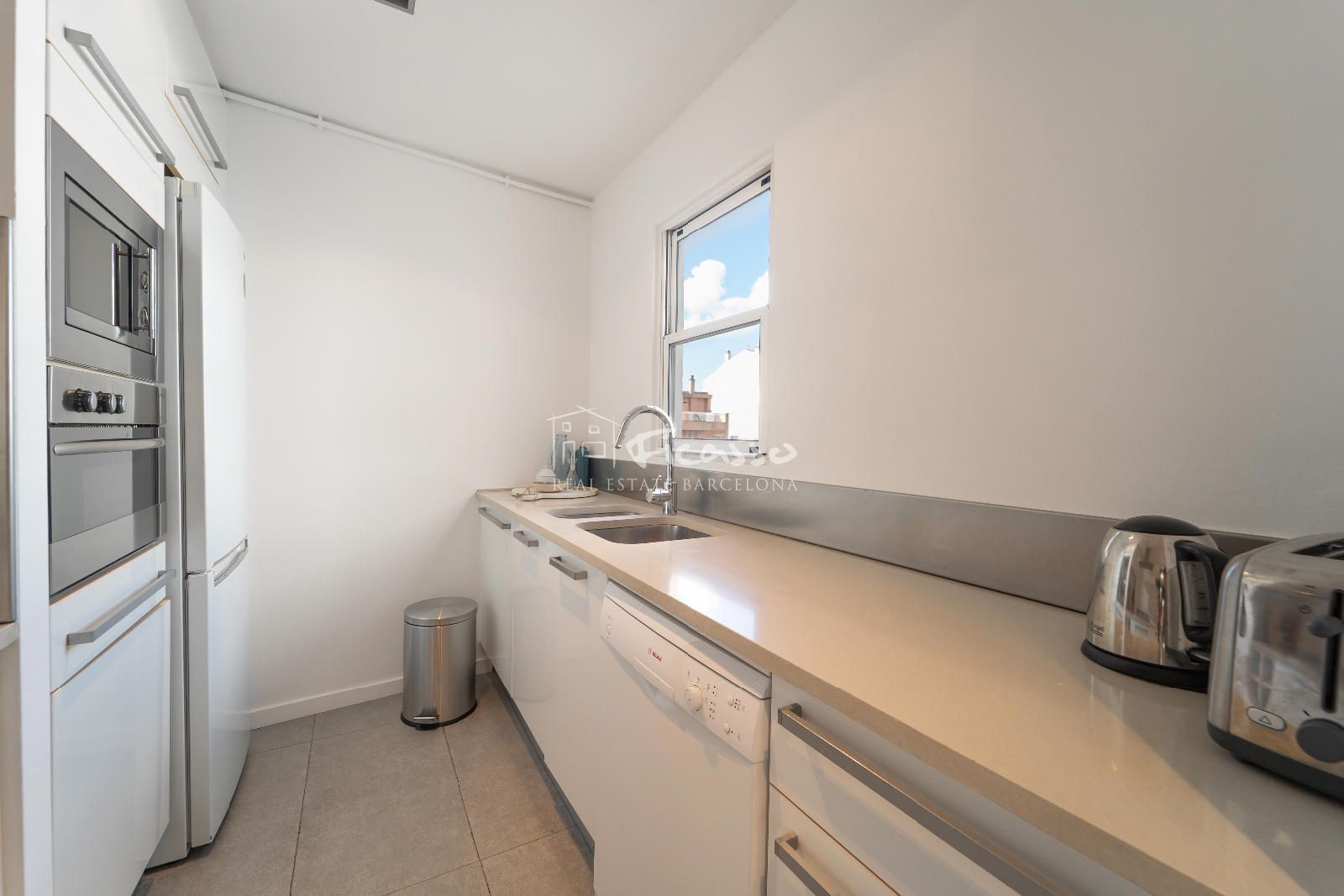 La estancia cuenta con una excelente distribución. Dispone de un salón-comedor con cocina abierta, una galería, dos habitaciones (una individual y una doble), dos baños independientes y dos terrazas grandes. El salón-comedor está amueblado con estanterías, un sofá, sillones y mesas de centro y mesa comedor de 4 comensales. Cocina abierta y moderna. Totalmente equipada con una gran isla, nevera, cocina de cinco fuegos, horno, microondas, lavavajillas y utensilios de cocina y de comedor. Al lado de la cocina encontramos un lavadero equipado con lavadora y la caldera de gas. La habitación doble está totalmente amueblada con cama doble y armario empotrado. Además la habitación dispone de una terraza privada grande con mesa y sillas para 2 personas y 2 tumbonas para tomar el sol de tarde. La habitación individual está amueblado como despacho para trabajar o estudiar. Los dos baño son completos. Uno de los baños es completo con plato de ducha y una ventana por donde entra mucha luz. El otro es completo con bañera, ducha de obra y con doble pica. Es un ático con dos terrazas, una de 22m2 que es privada de la habitación principal y tiene vista a Tibidabo y la otra de 29m2 que se accede por el salón, con vistas al mar y a la Sagrada familia. El ático es totalmente exterior por lo que reciben mucha luz solar durante el día.