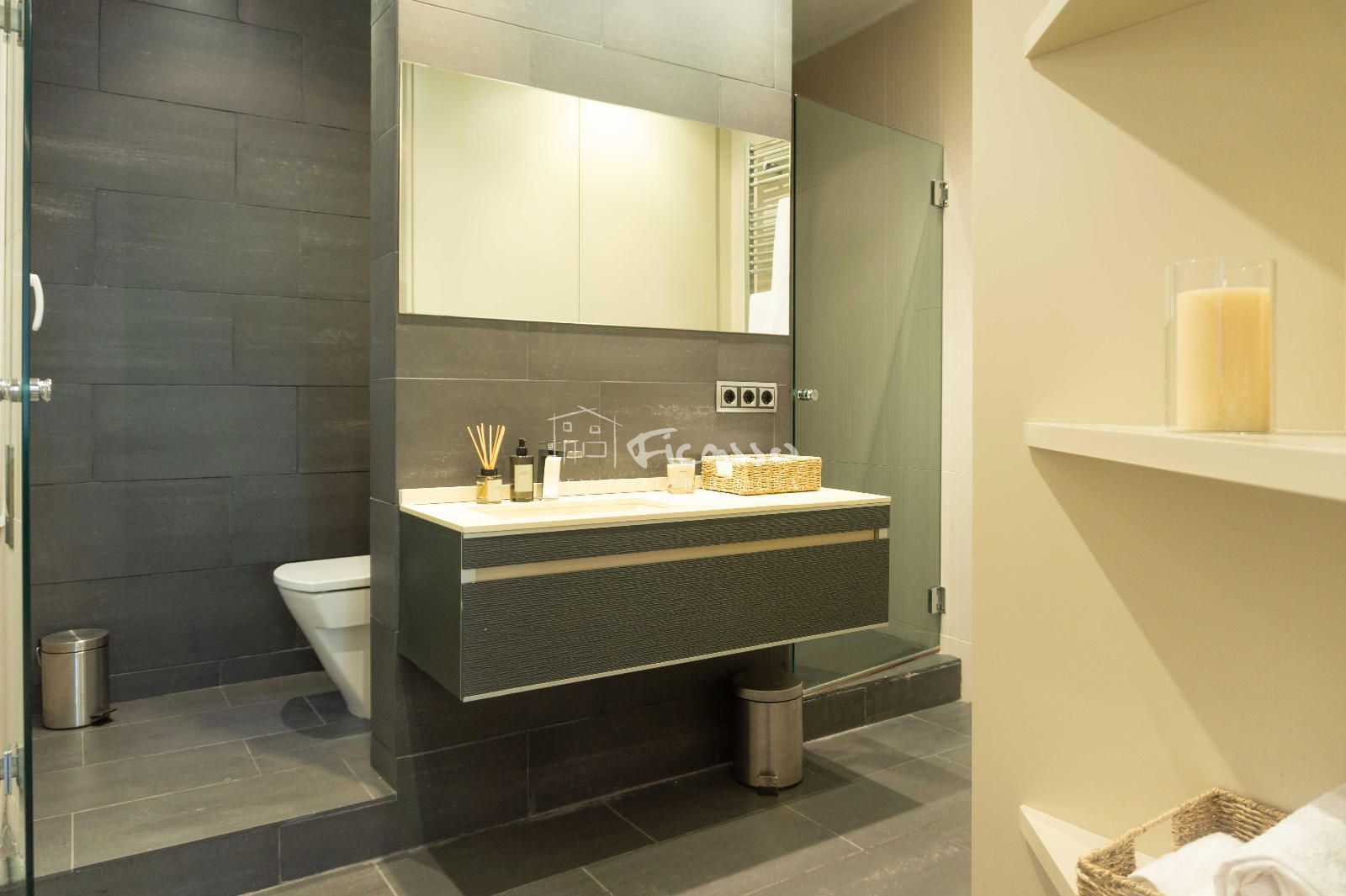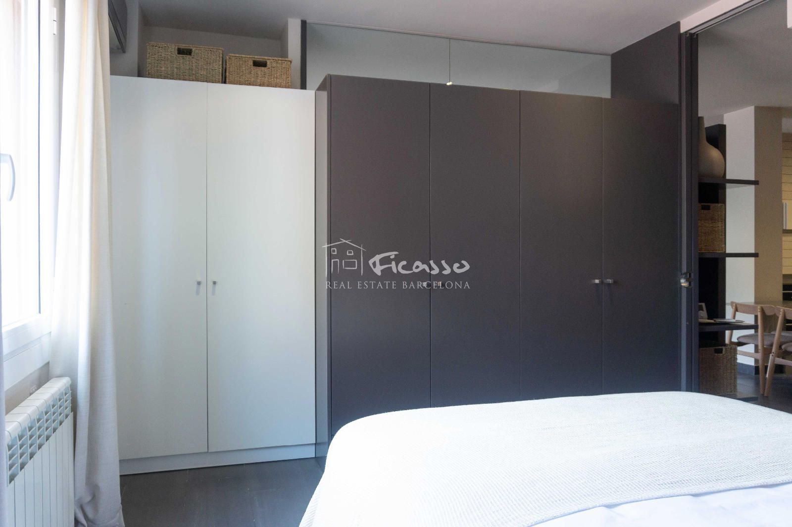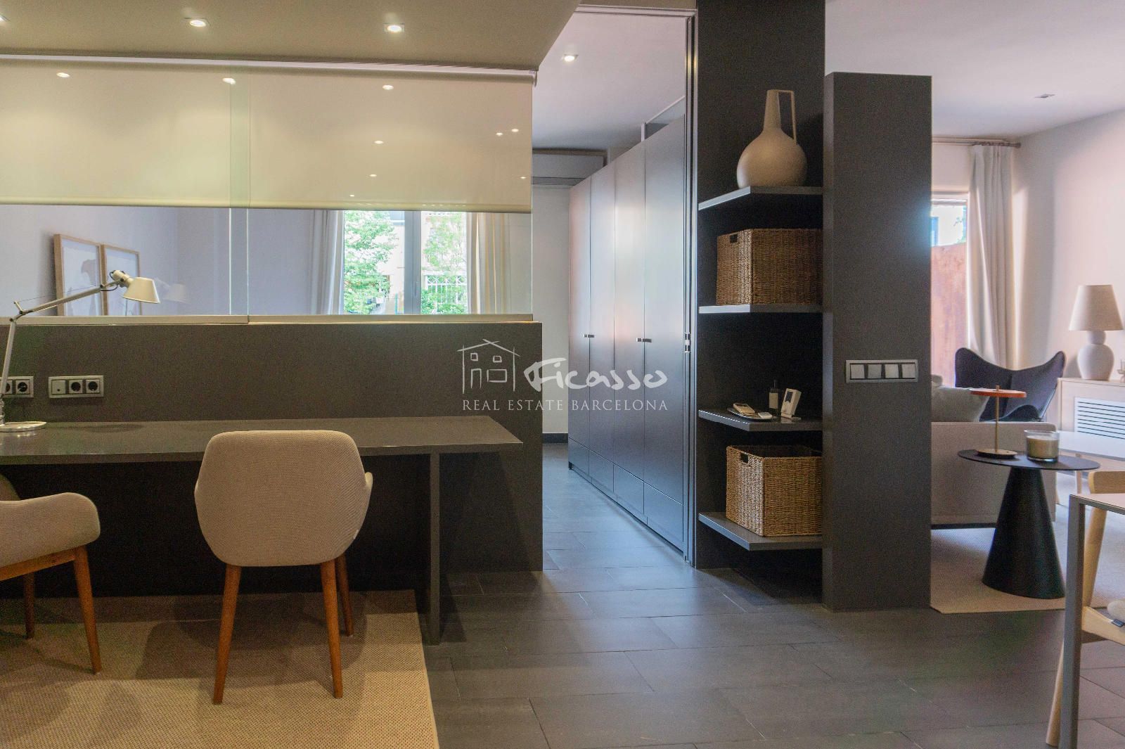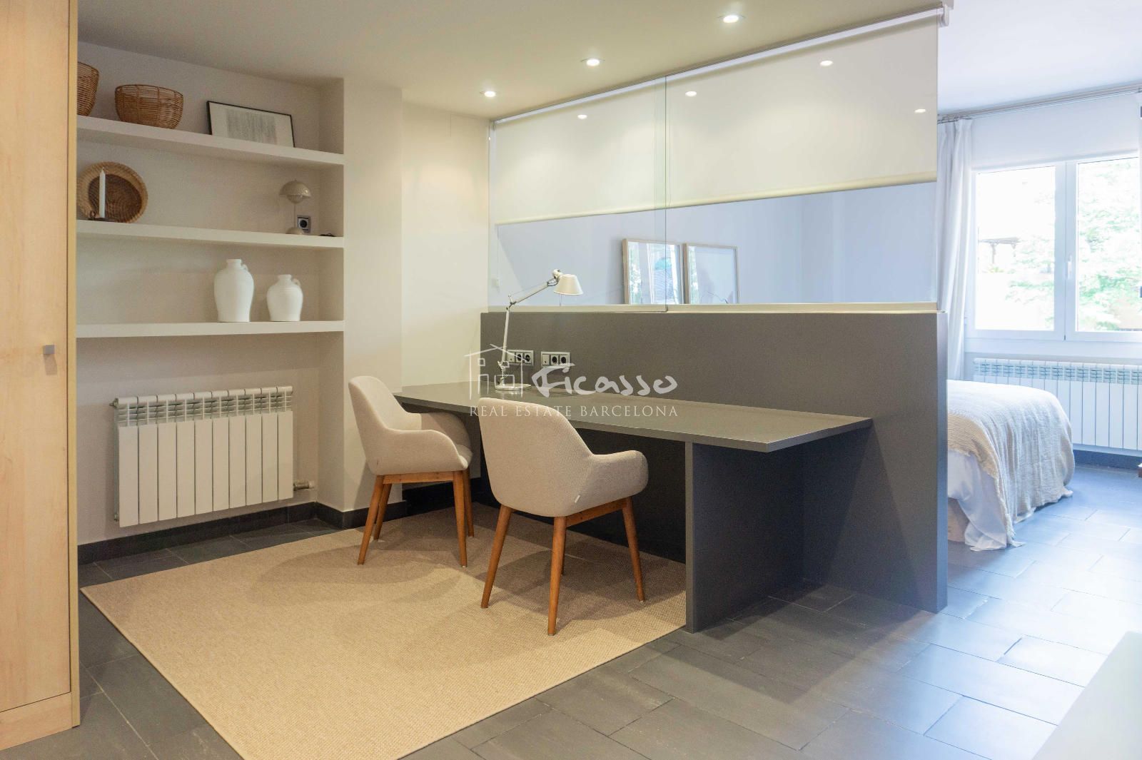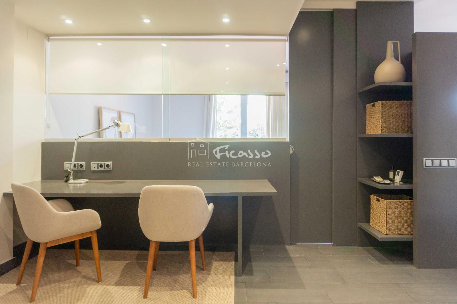 La cocina está completamente equipada con horno, cocina de inducción, nevera, lavavajillas, microondas y menaje de cocina. La parte despacho tiene un espacio de trabajo amplio, estantería y muebles de almacenaje y está separada de la habitación por grandes ventanas que proporcionan luz natural. La habitación tiene cama canapé y grandes armarios. El baño, moderno, tiene una ducha de obra, armarios, lavadora y secadora.