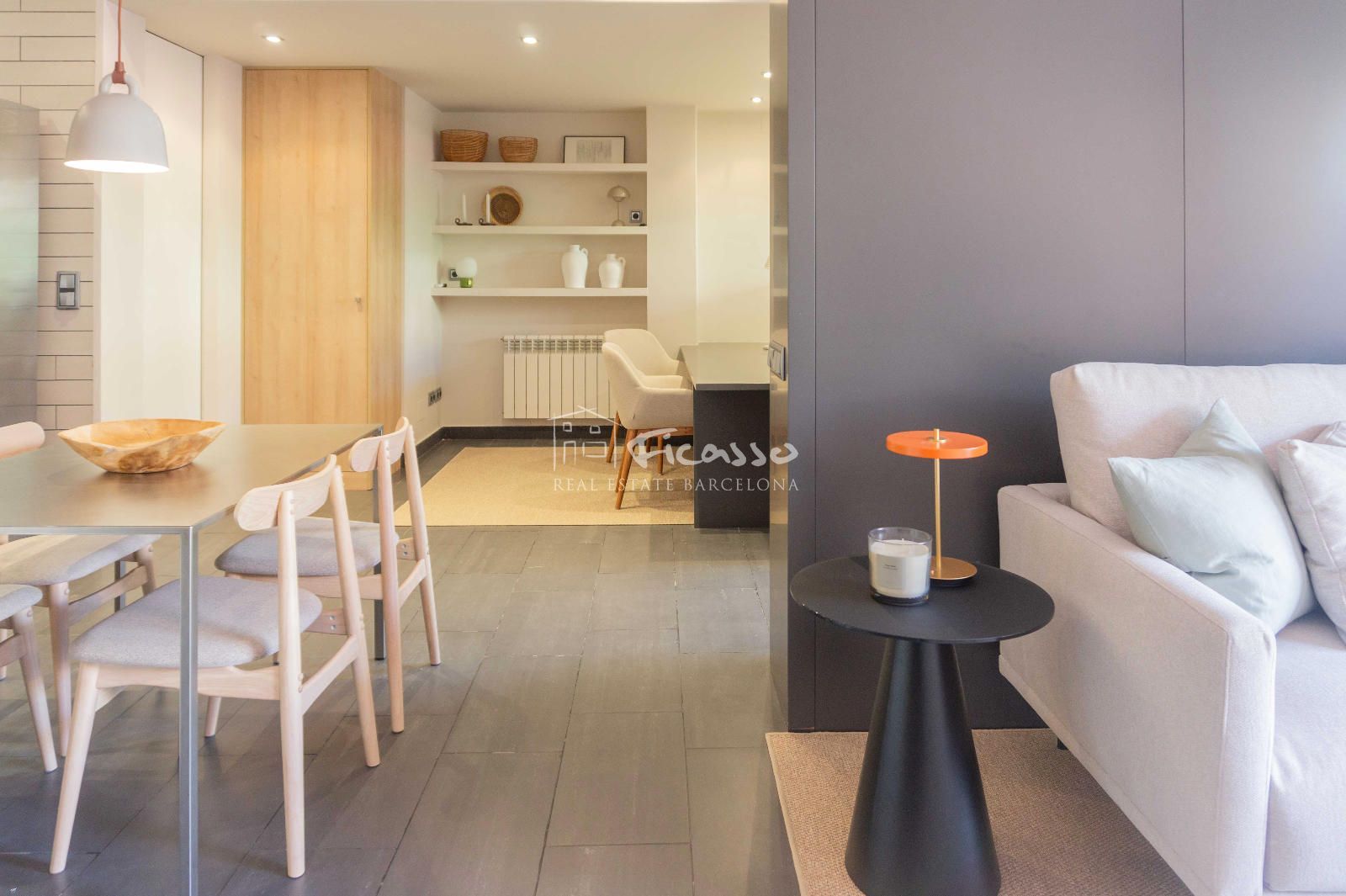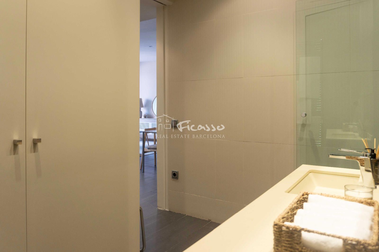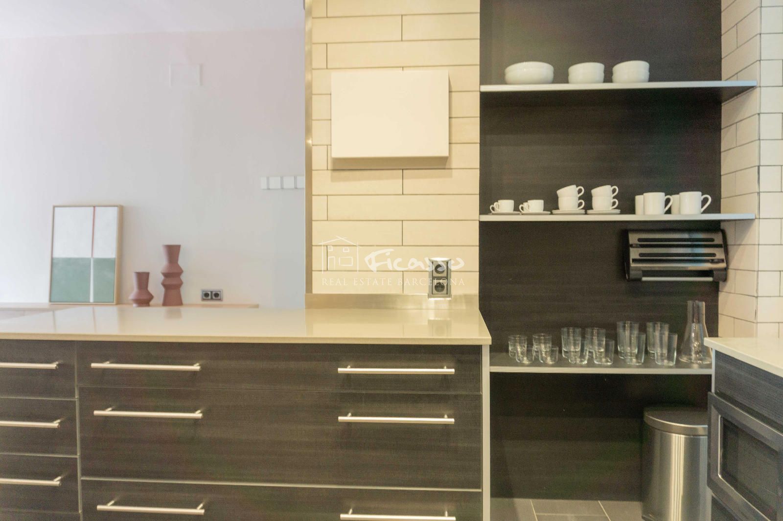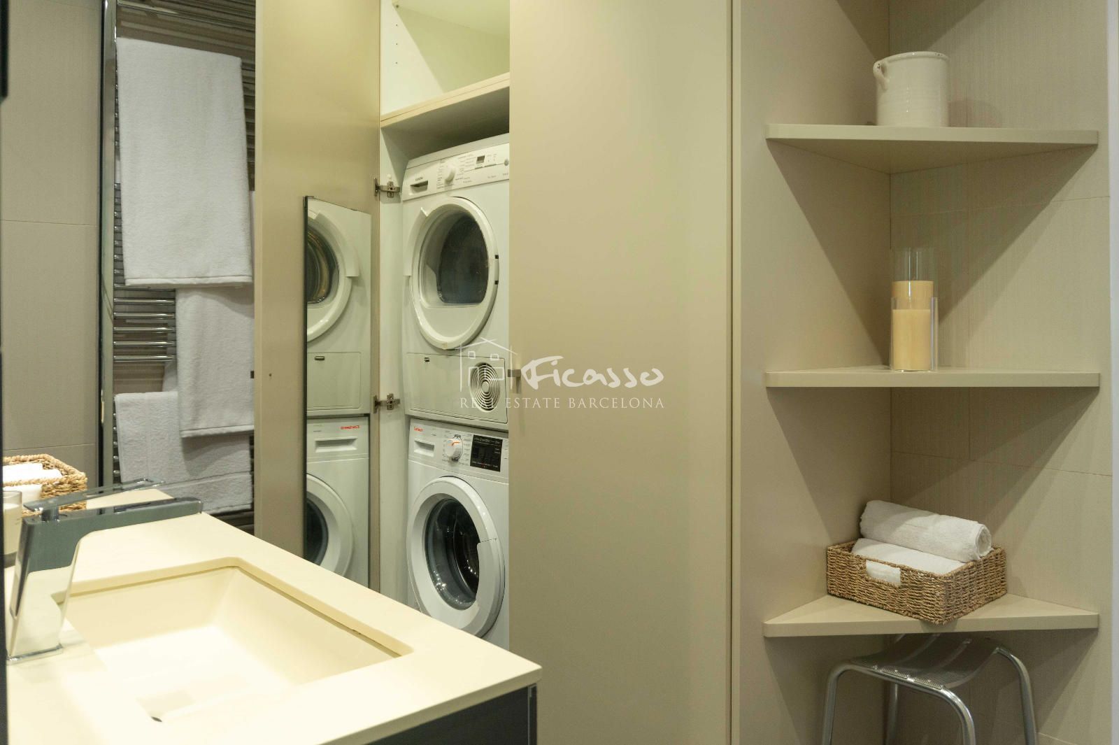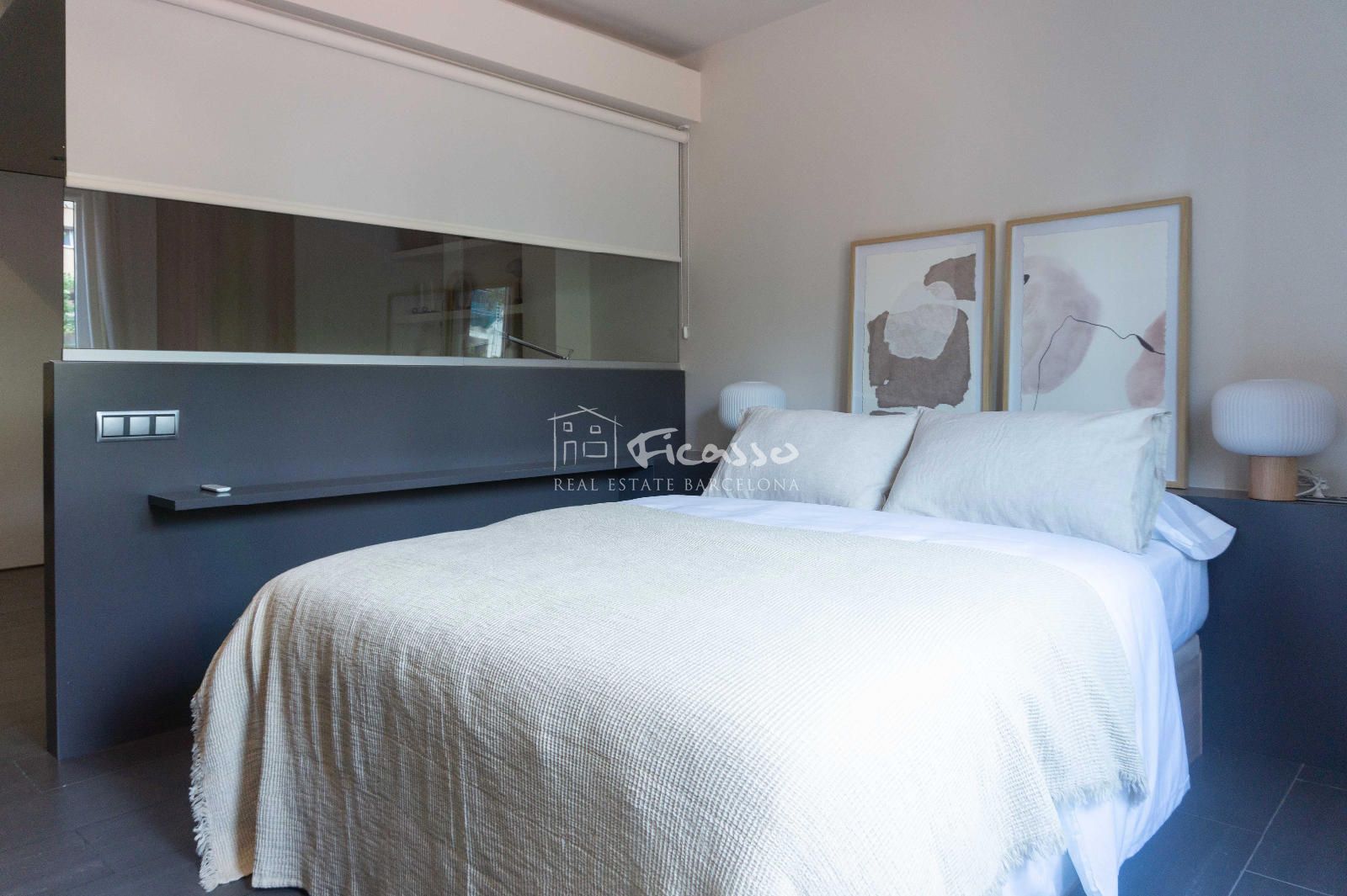 La cocina está completamente equipada con horno, cocina de inducción, nevera, lavavajillas, microondas y menaje de cocina. La parte despacho tiene un espacio de trabajo amplio, estantería y muebles de almacenaje y está separada de la habitación por grandes ventanas que proporcionan luz natural. La habitación tiene cama canapé y grandes armarios. El baño, moderno, tiene una ducha de obra, armarios, lavadora y secadora.