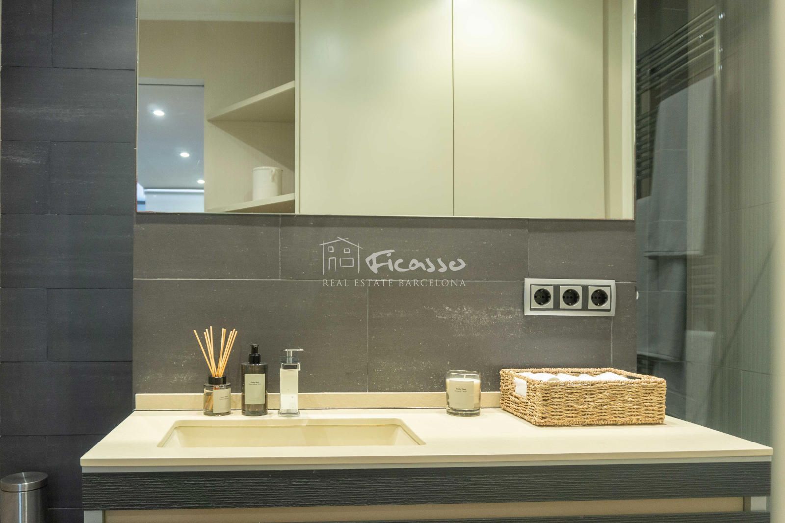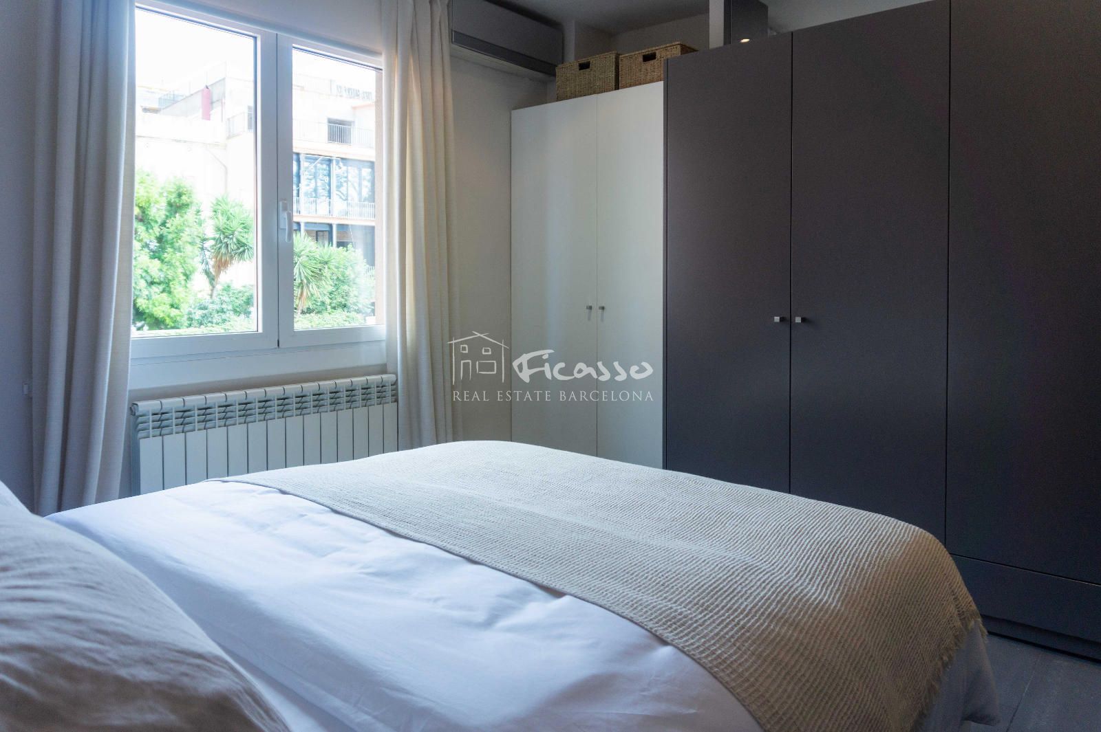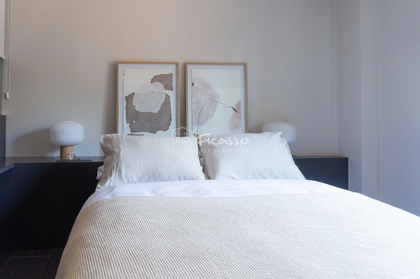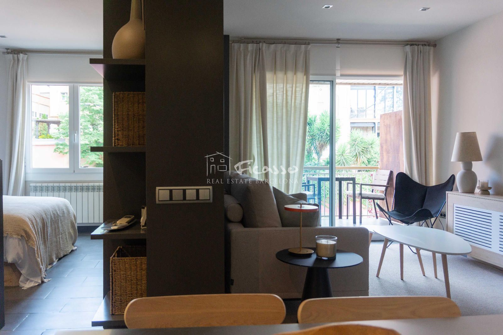 La cocina está completamente equipada con horno, cocina de inducción, nevera, lavavajillas, microondas y menaje de cocina. La parte despacho tiene un espacio de trabajo amplio, estantería y muebles de almacenaje y está separada de la habitación por grandes ventanas que proporcionan luz natural. La habitación tiene cama canapé y grandes armarios. El baño, moderno, tiene una ducha de obra, armarios, lavadora y secadora.