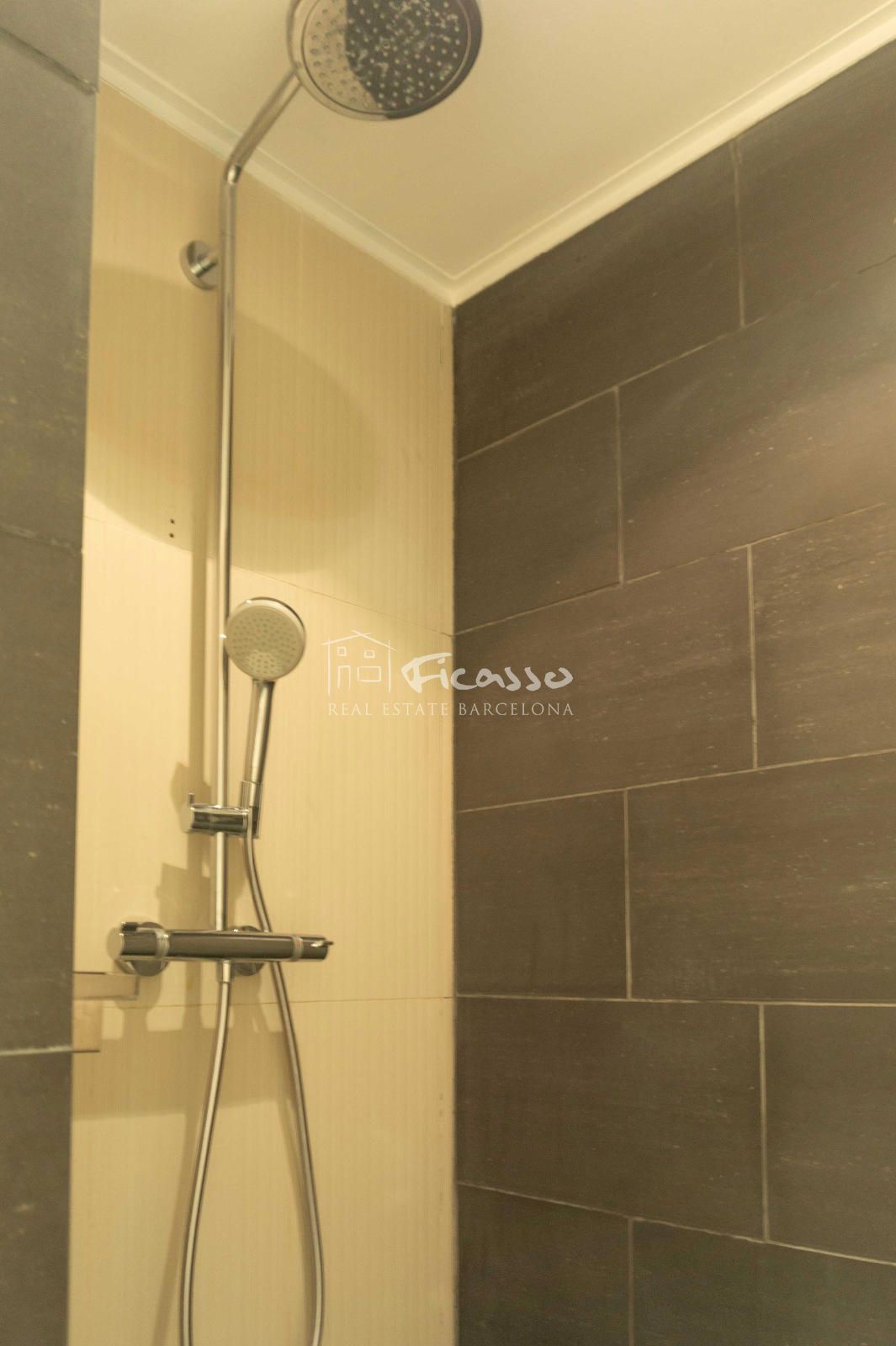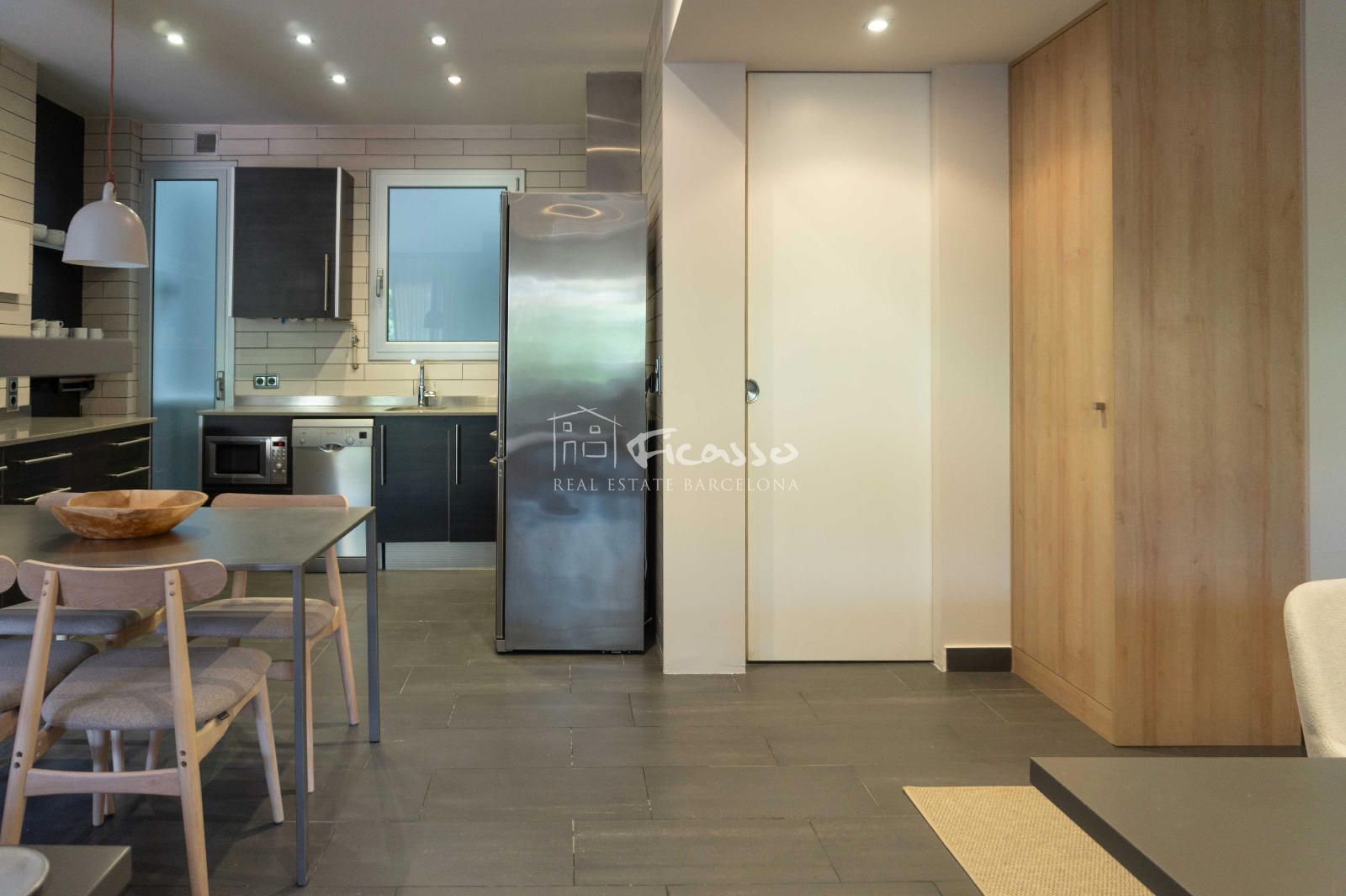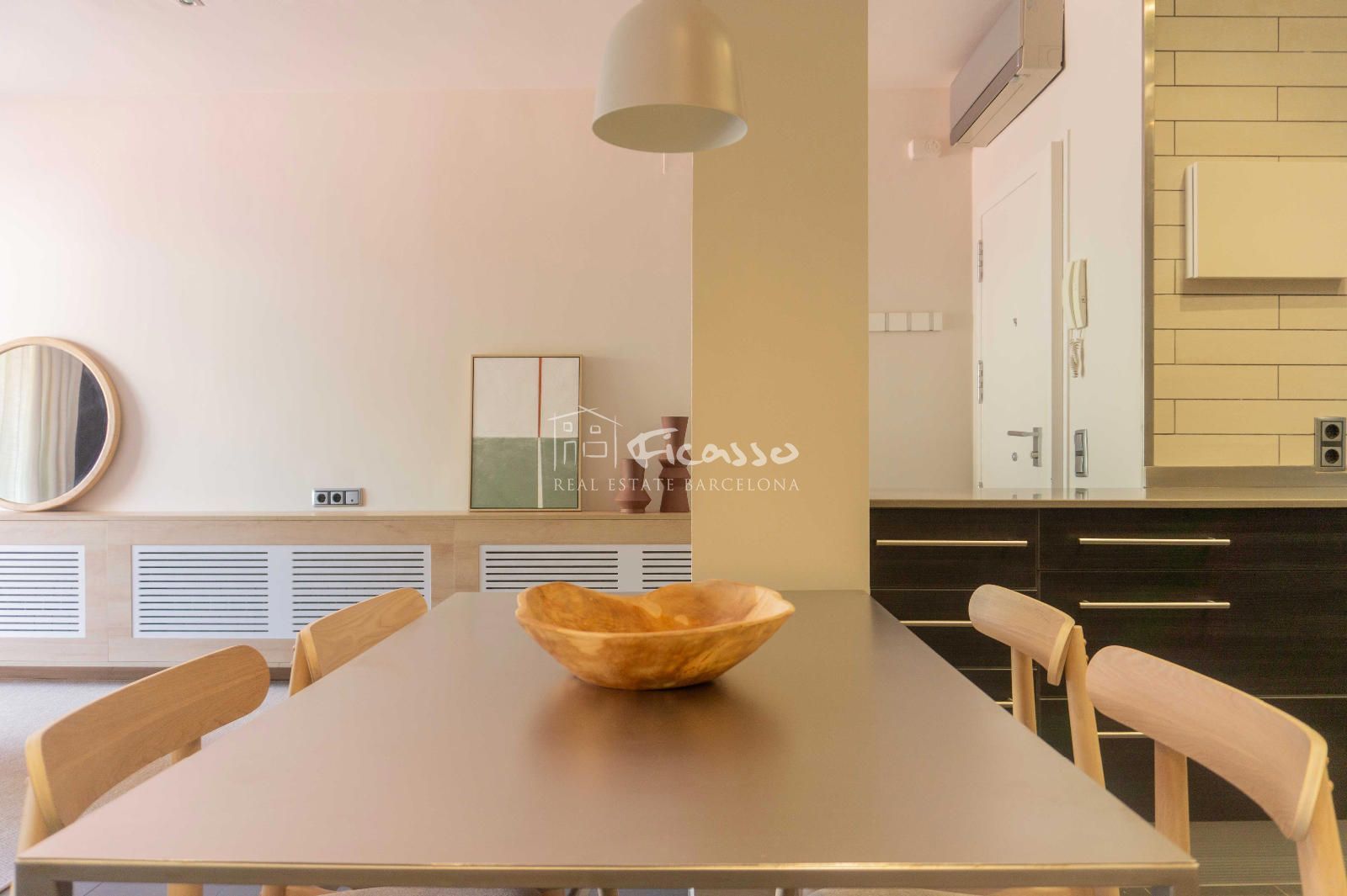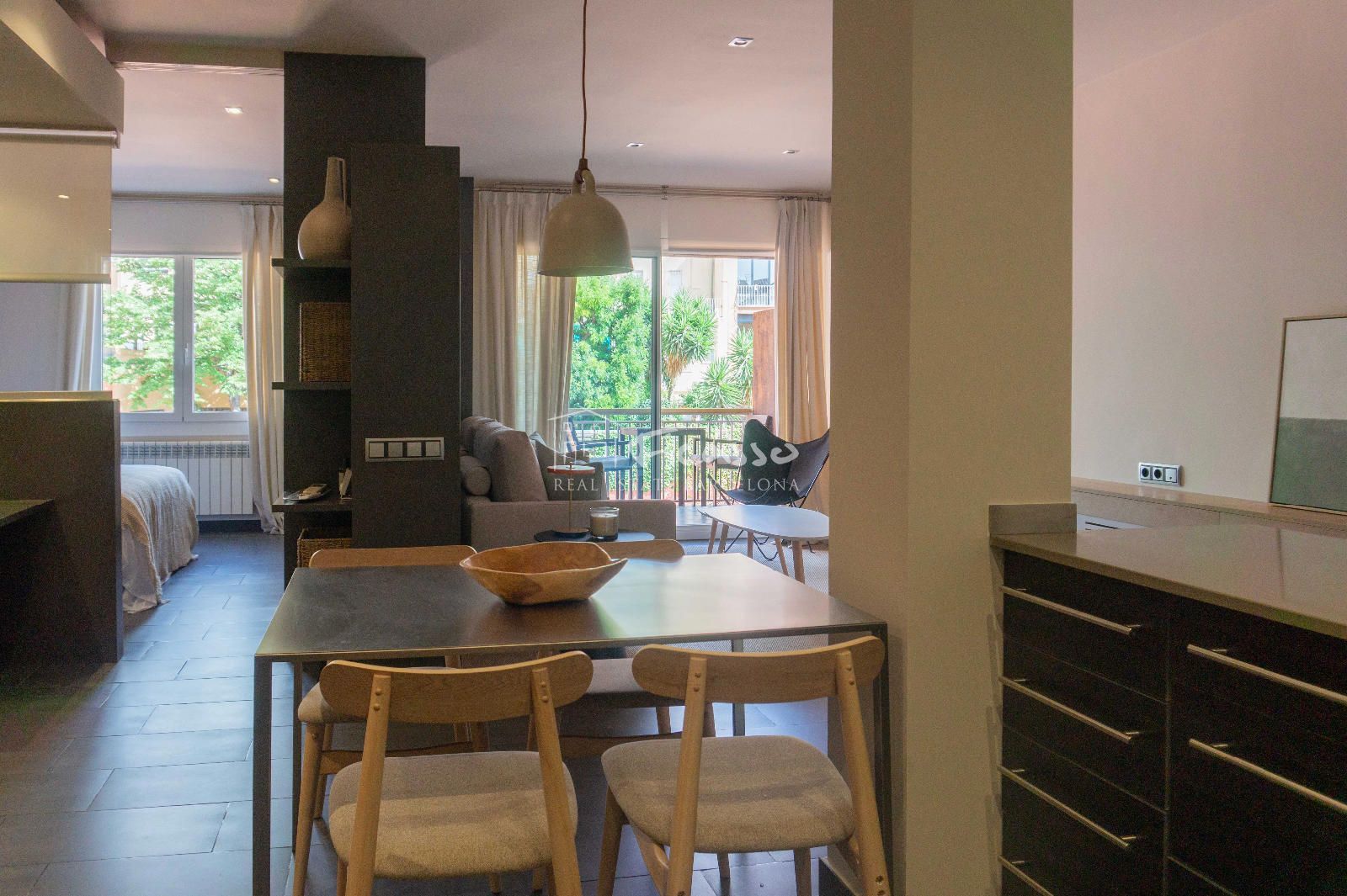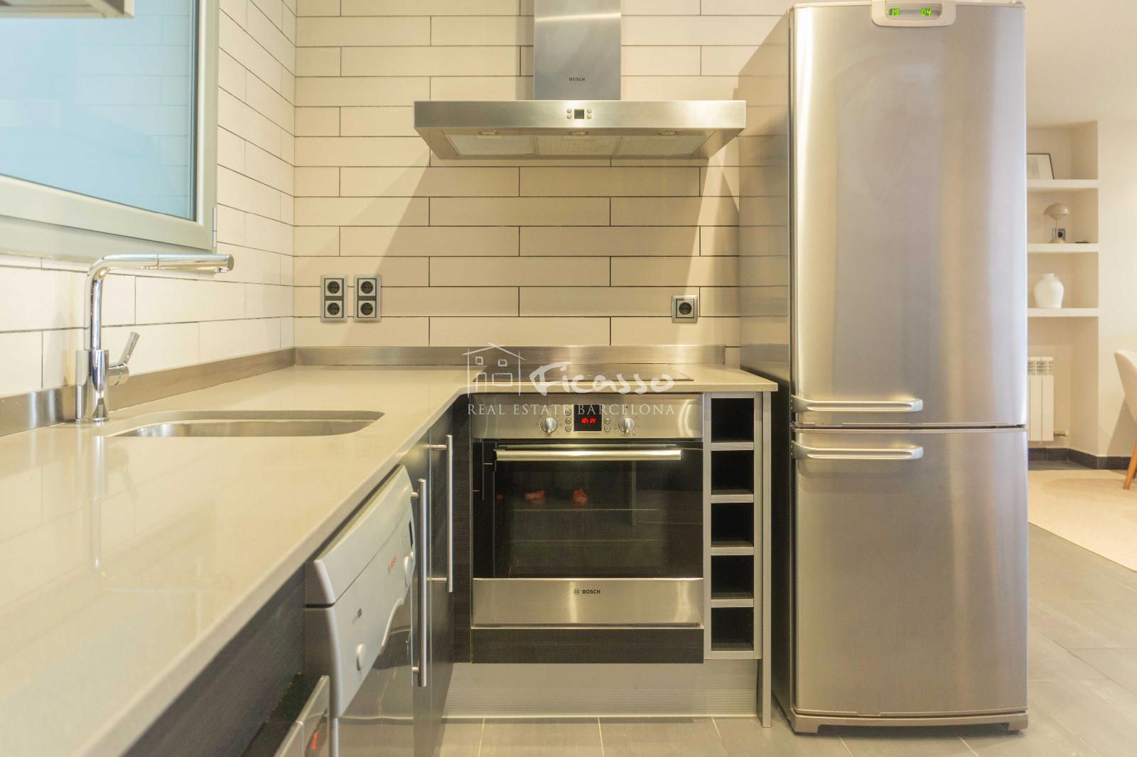 La cocina está completamente equipada con horno, cocina de inducción, nevera, lavavajillas, microondas y menaje de cocina. La parte despacho tiene un espacio de trabajo amplio, estantería y muebles de almacenaje y está separada de la habitación por grandes ventanas que proporcionan luz natural. La habitación tiene cama canapé y grandes armarios. El baño, moderno, tiene una ducha de obra, armarios, lavadora y secadora.