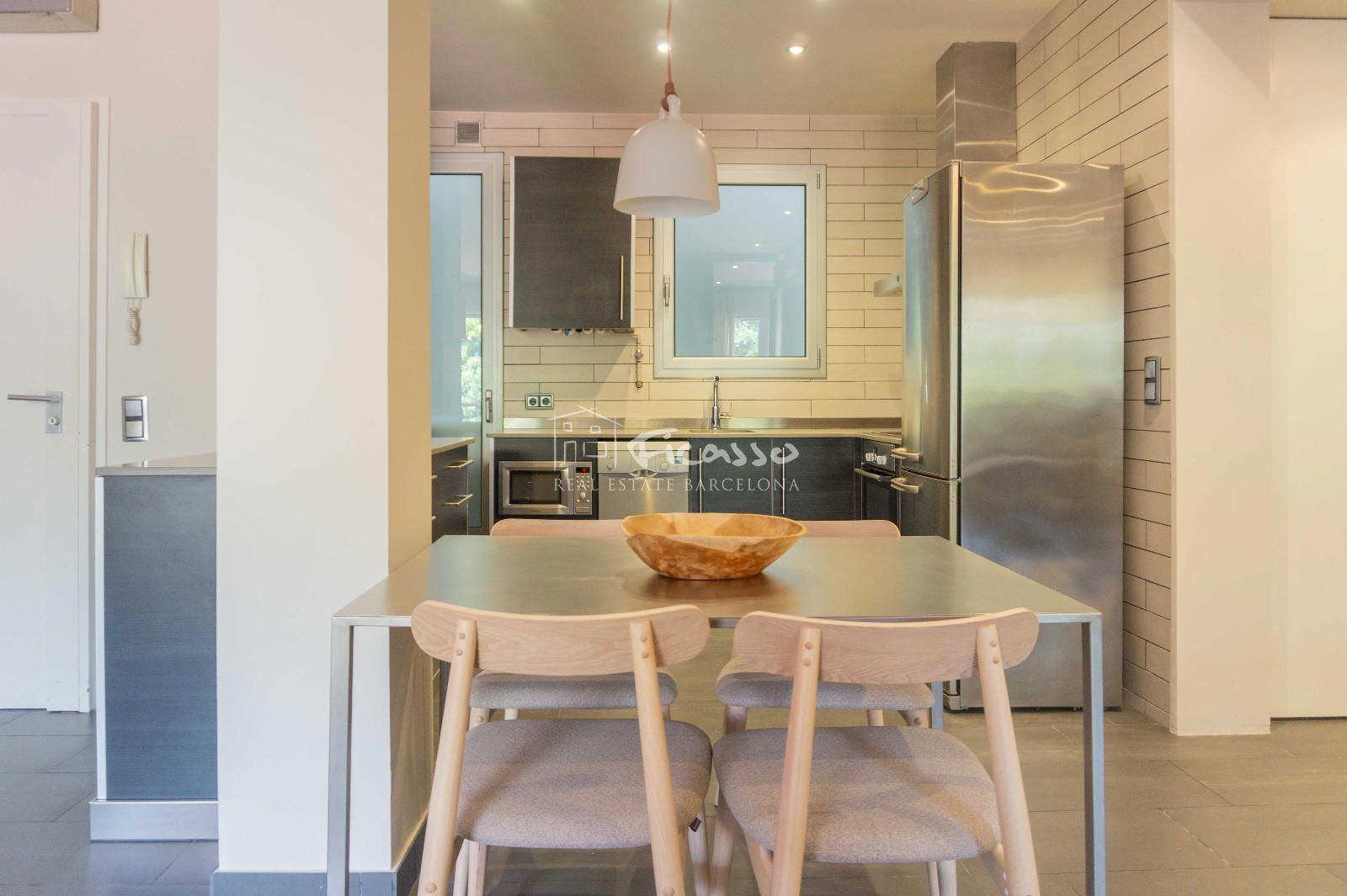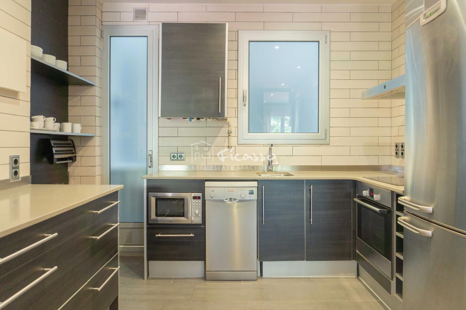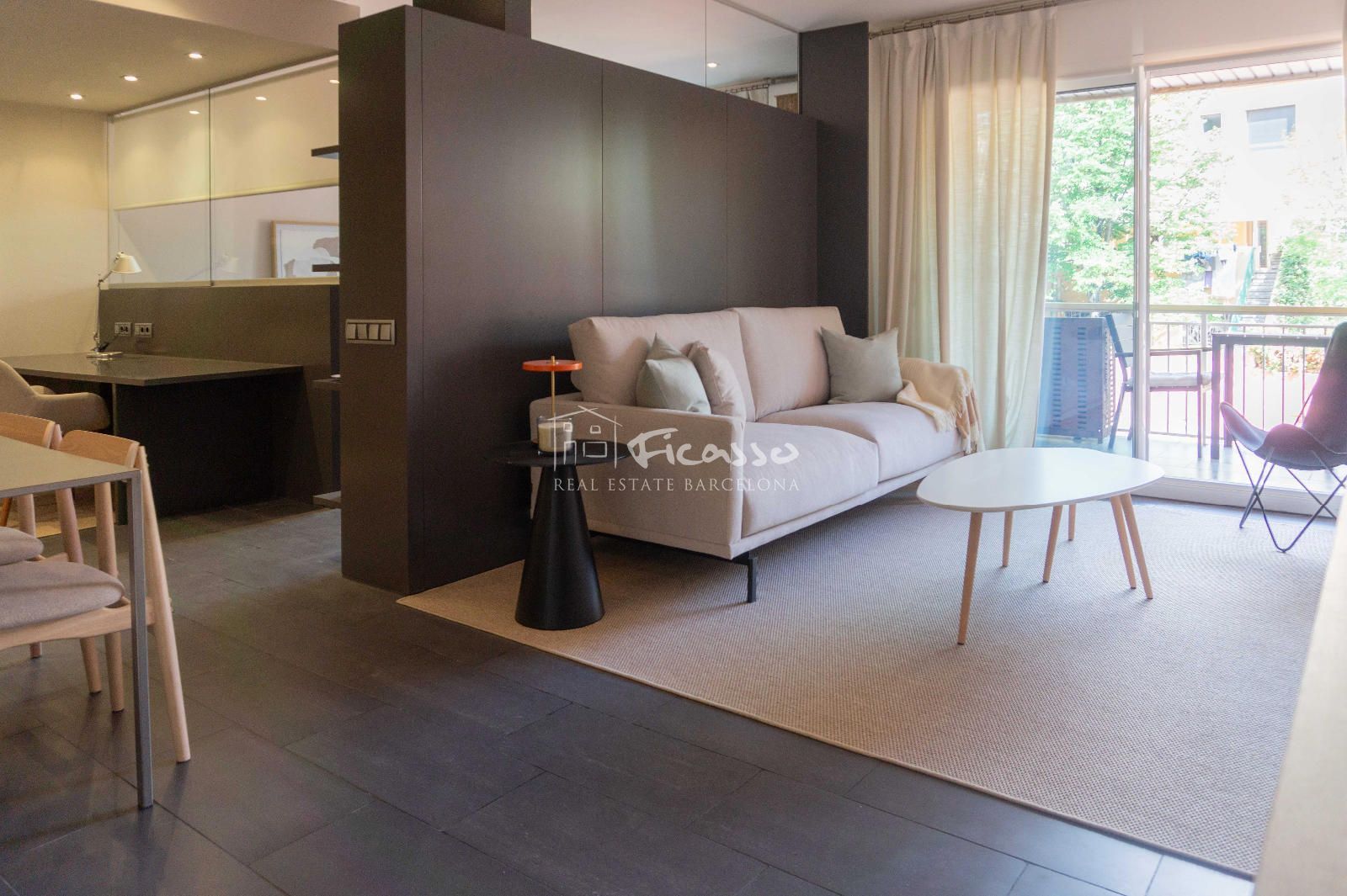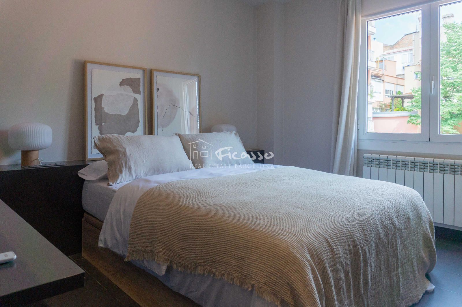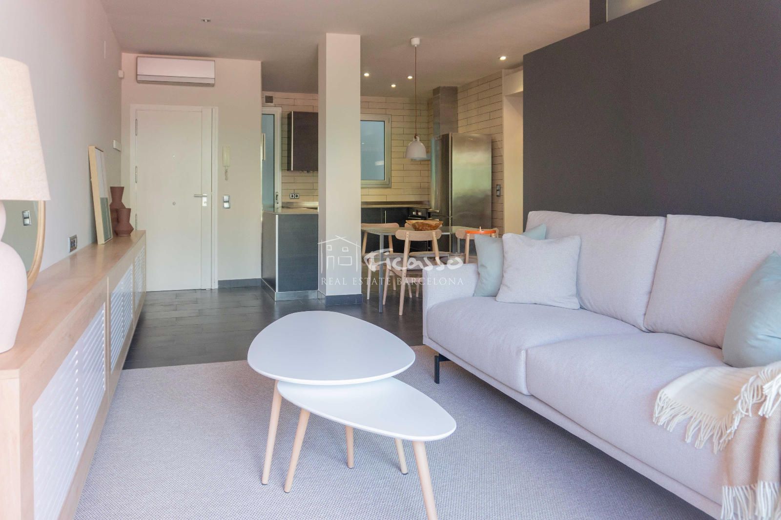 La cocina está completamente equipada con horno, cocina de inducción, nevera, lavavajillas, microondas y menaje de cocina. La parte despacho tiene un espacio de trabajo amplio, estantería y muebles de almacenaje y está separada de la habitación por grandes ventanas que proporcionan luz natural. La habitación tiene cama canapé y grandes armarios. El baño, moderno, tiene una ducha de obra, armarios, lavadora y secadora.